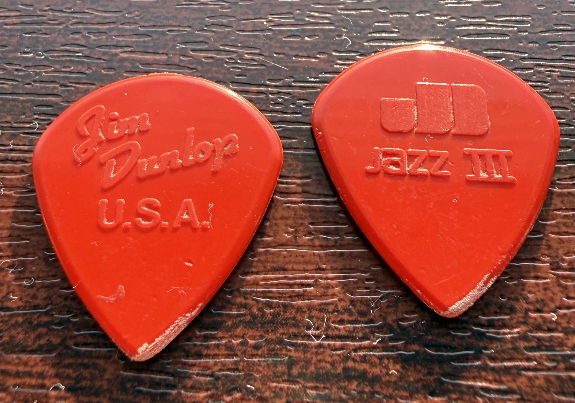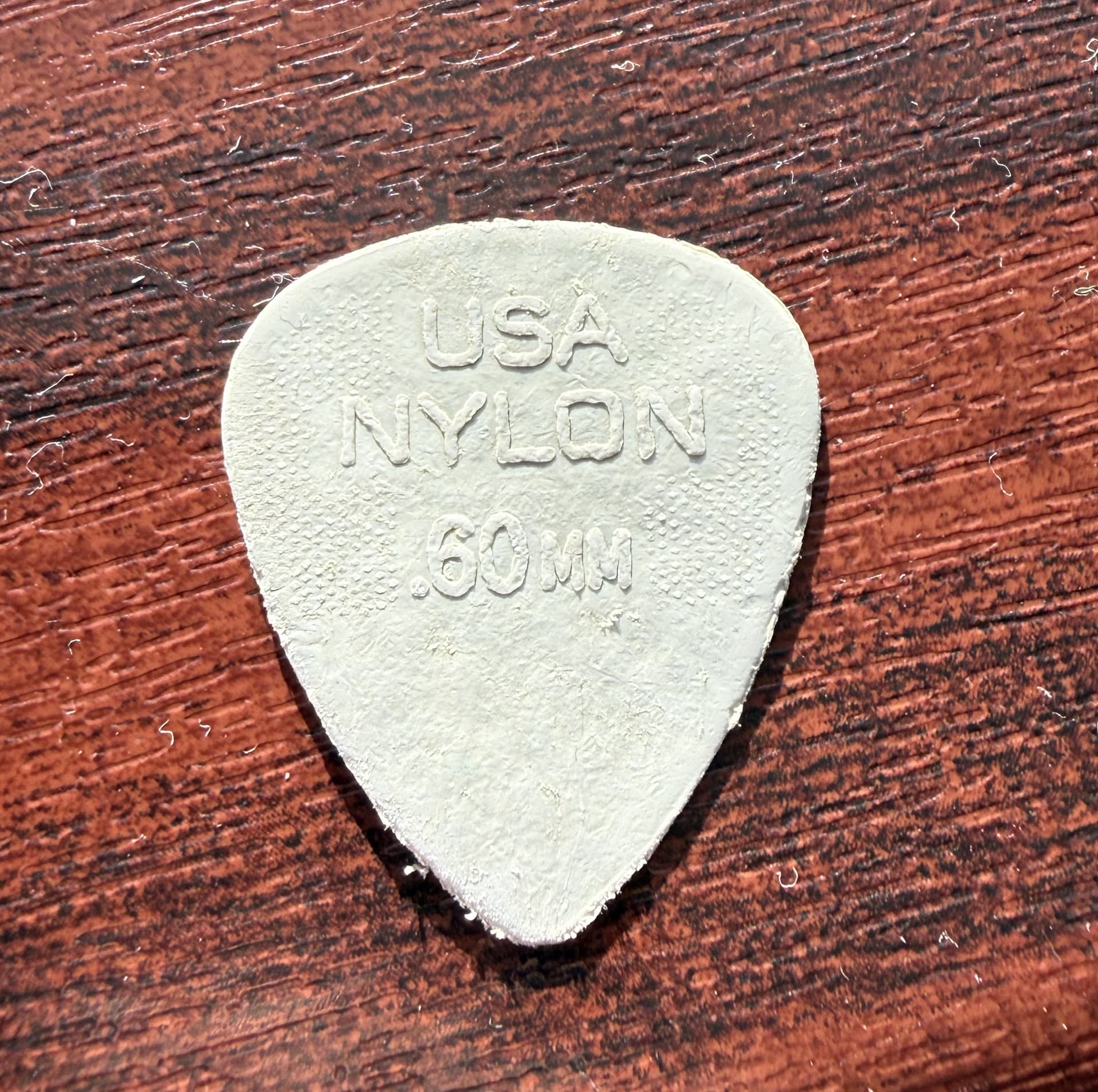 The first one I started using was a Dunlop .60mm nylon. It has seen better days, but I will also hold on to it. You can see that I chewed at it back then