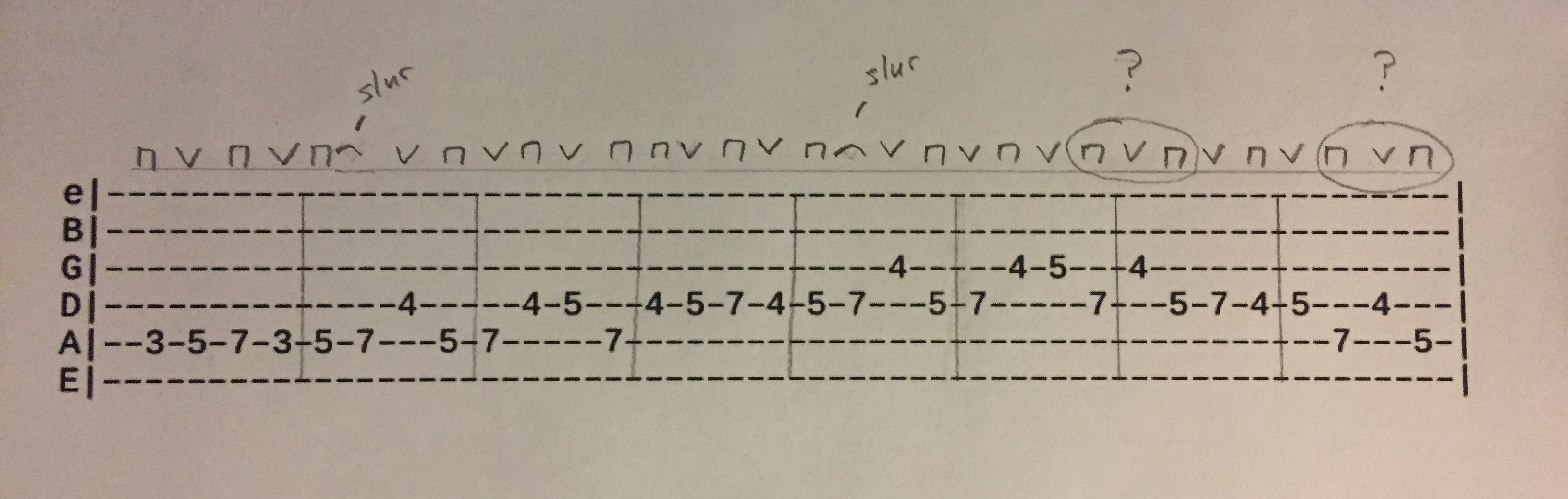 Here are some photos of the tablature for the passage in question, and another photo of the same tablature with my pick direction choice annotations (I hope they’re legible).