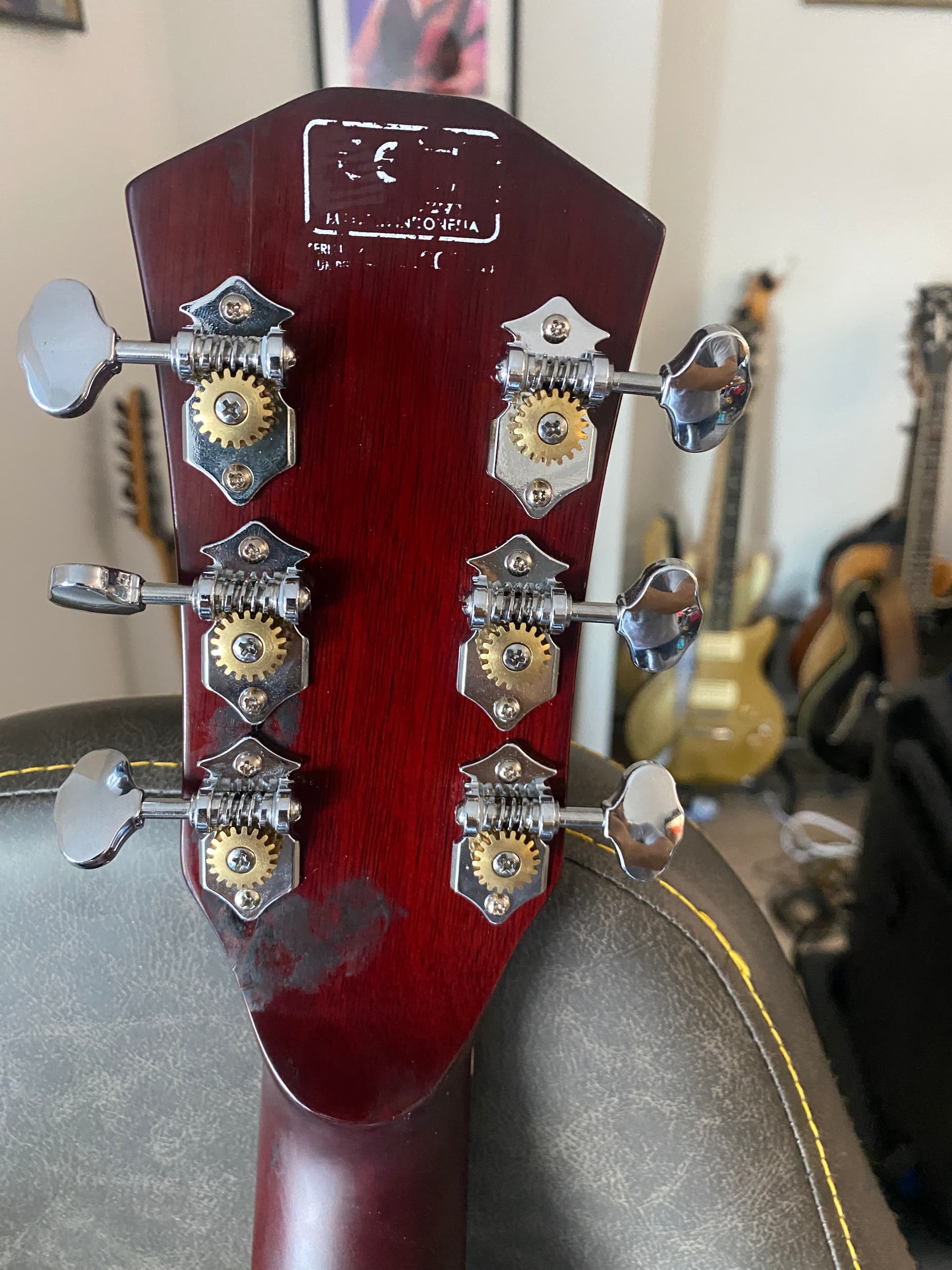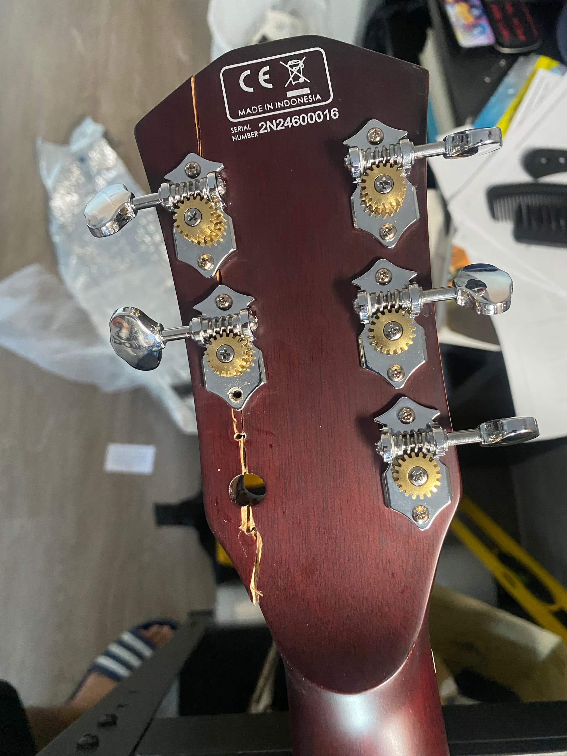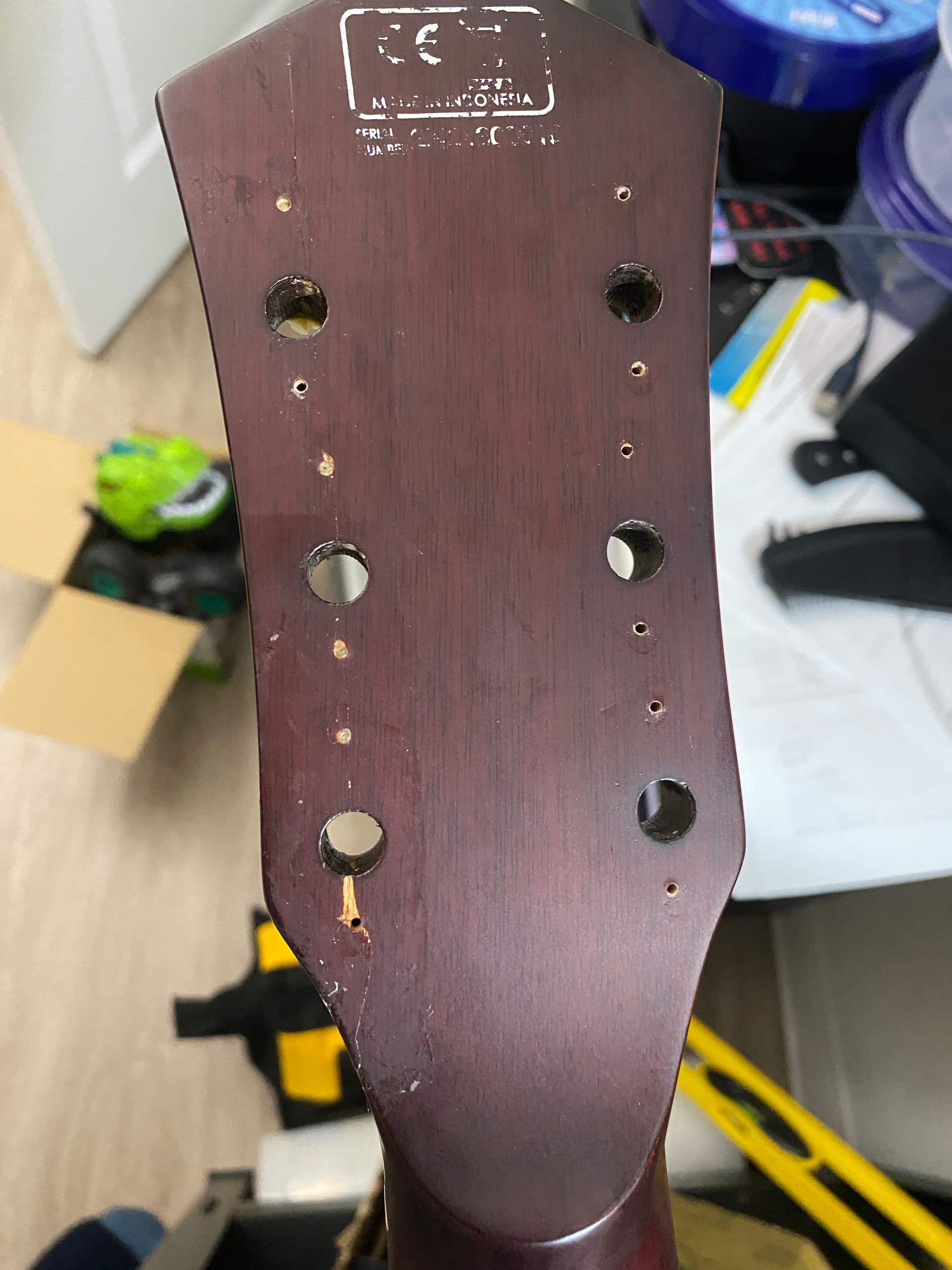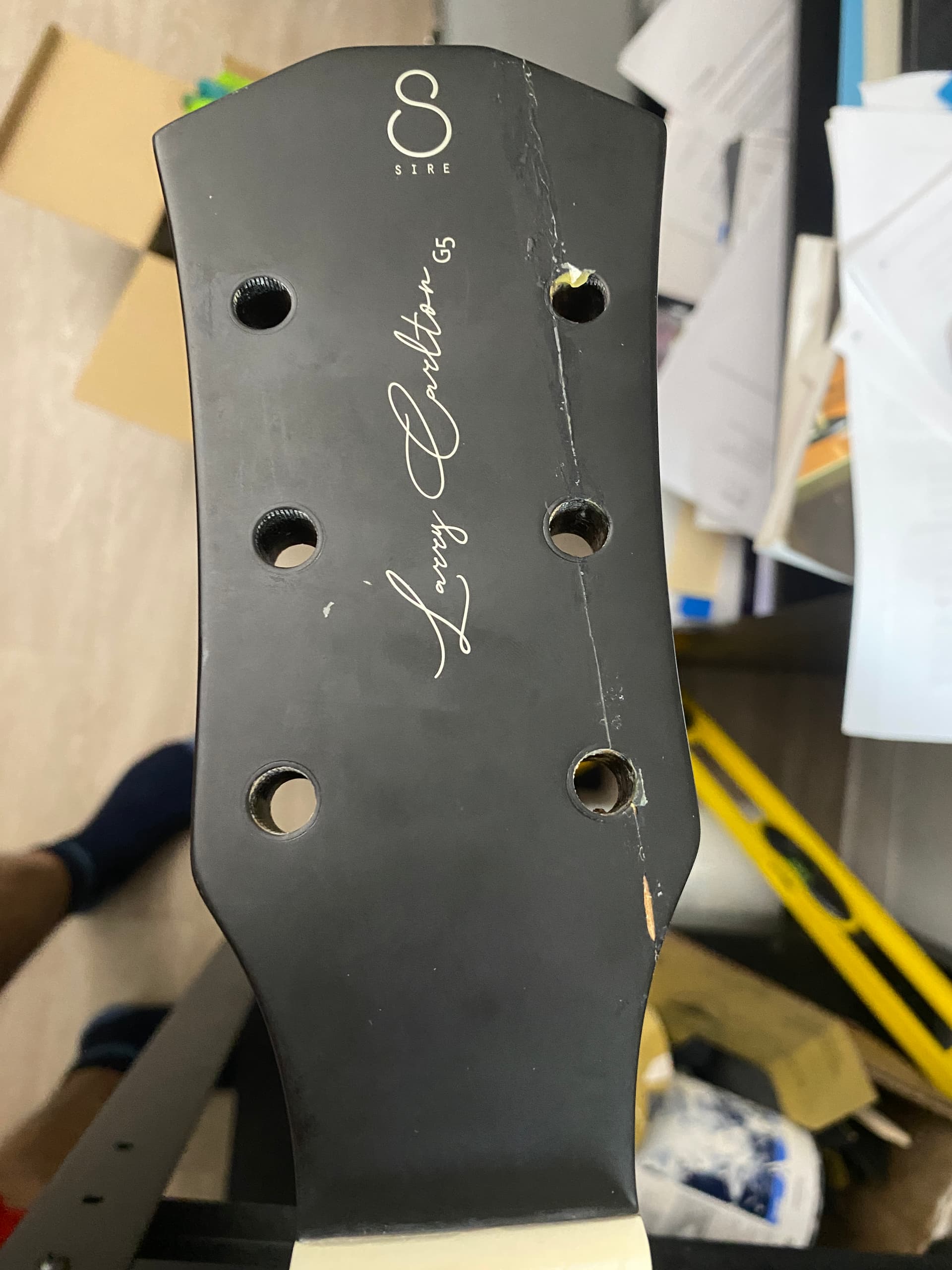 I’ve accidentally knocked my Sire electroacoustic and the hit against the floor broke the headstock. Yay!